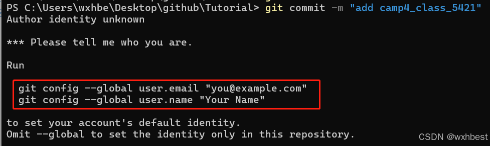 这里需要注意的一点,在git commit时,首先会提醒你要进行一个身份的设置