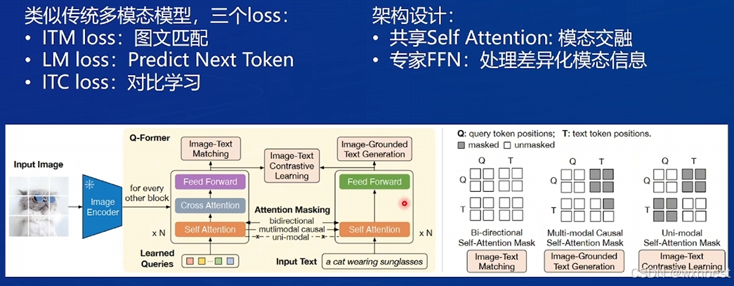 - Q-Former 对接视觉特征:(1)Q-Former 是一个轻量级的 Transformer 模块,包含固定数量的 learnable queries(可学习查询向量)。(2)Q-Former通过 self-attention 和 cross-attention 机制,将 learnable queries 与视觉特征进行交互,从图像特征中提取与语言模态关联性更强的信息。