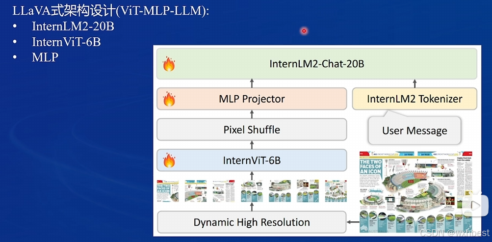 InternVL2 是一种多模态大模型,主要架构包括 ViT、Pixel Shuffle 和 MLP,并在训练过程中采用动态分辨率。