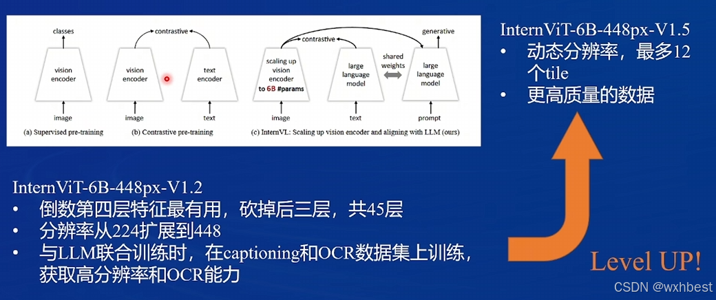 - 不同于 CLIP(丢弃了文本编码器,仅使用视觉编码器生成跨模态嵌入),InternVL2 保留了文本编码器,使得模型能够直接处理文本信息,而不依赖额外的嵌入生成步骤。
