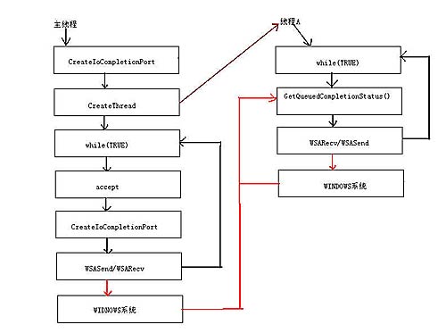 我们不停地发出异步的WSASend/WSARecv IO操作,具体的IO处理过程由WINDOWS系统完成,WINDOWS系统完成实际的IO处理后,把结果送到完成端口上(如果有多个IO都完成了,那么就在完成端口那里排成一个队列)。我们在另外一个线程里从完成端口不断地取出IO操作结果,然后根据需要再发出WSASend/WSARecv IO操作。