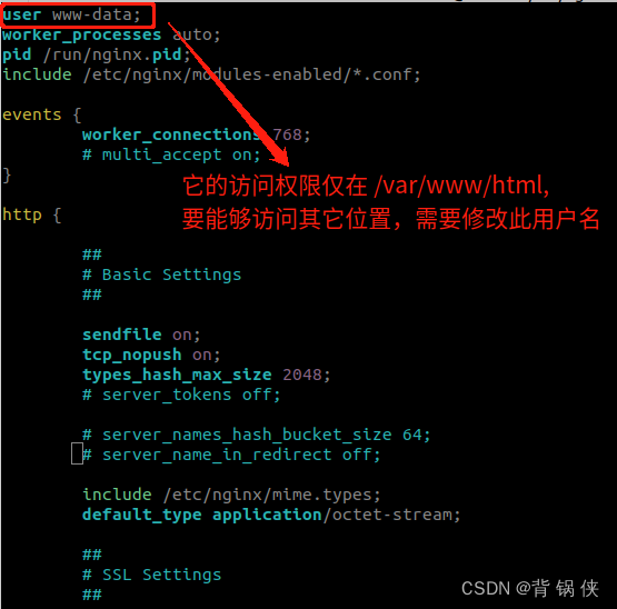 nginx 的默认根目录在 /var/www/html 目录中,默认用户为 www-data,无法访问 /var/www/html 之外的资源,因此需要修改 /etc/nginx/nginx.conf 中的 user ,让它能够访问其它路径。