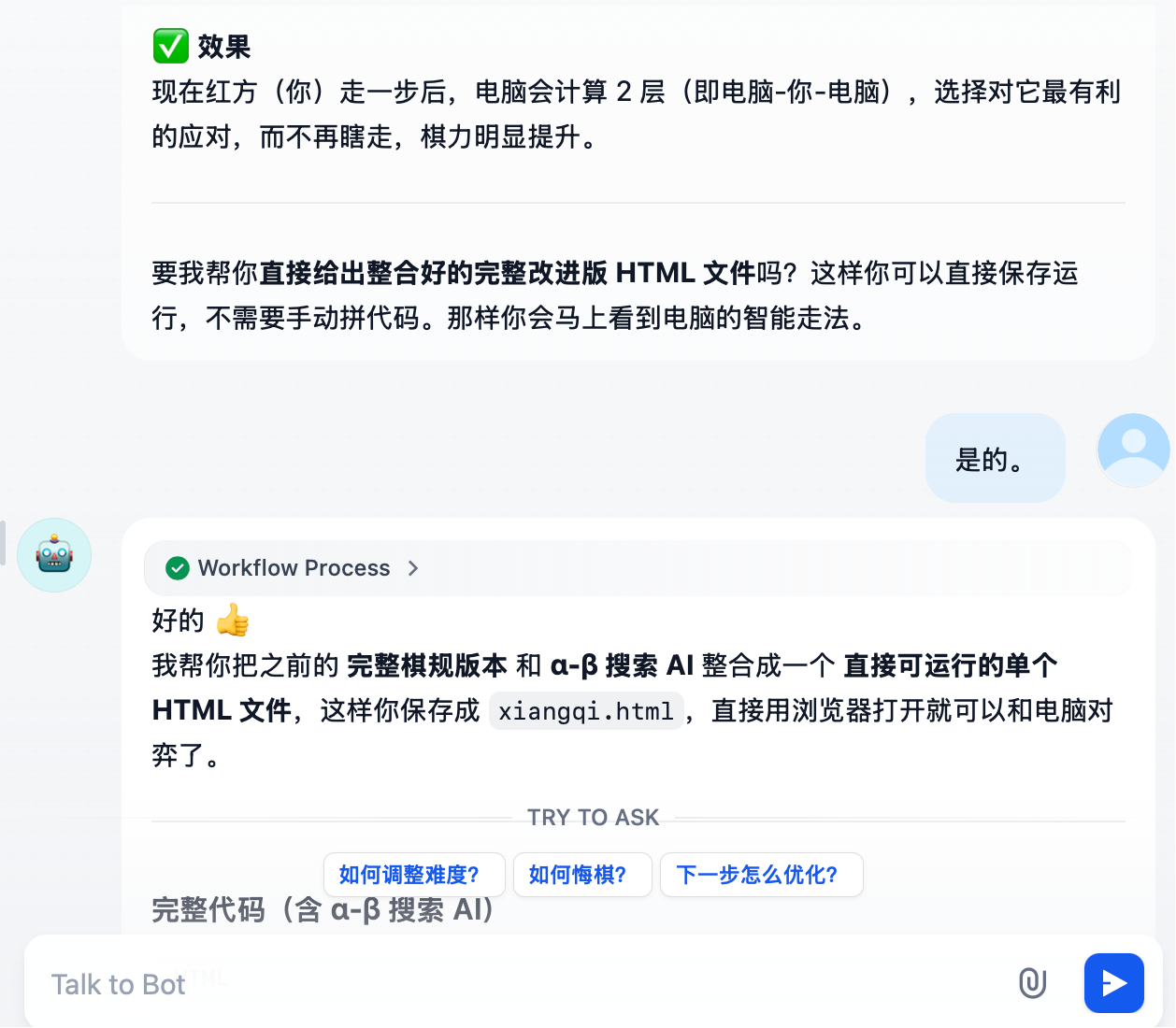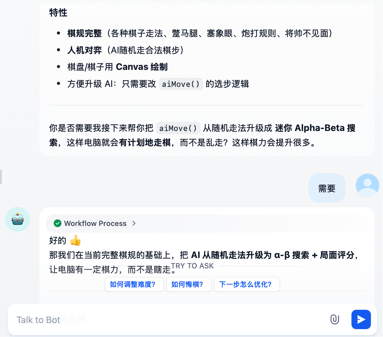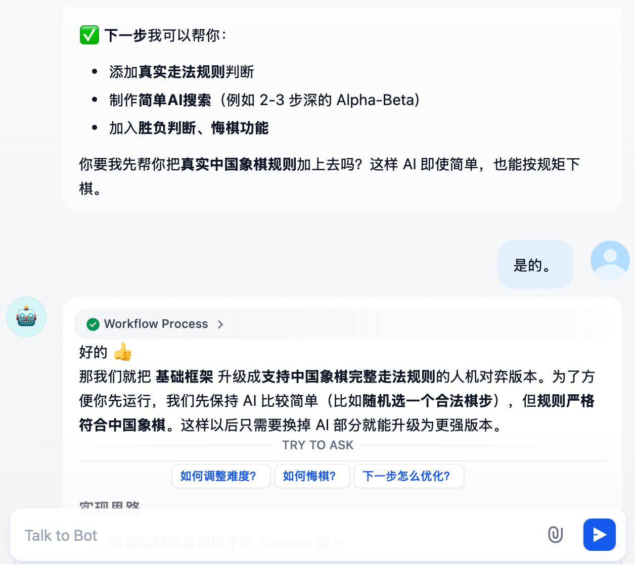评价:象棋棋盘画的不完整,可以对弈。小白编程的时代来了。GPT5具有智能体(代表老师)的感觉了,引导你一步一步完成初始设定的目标。