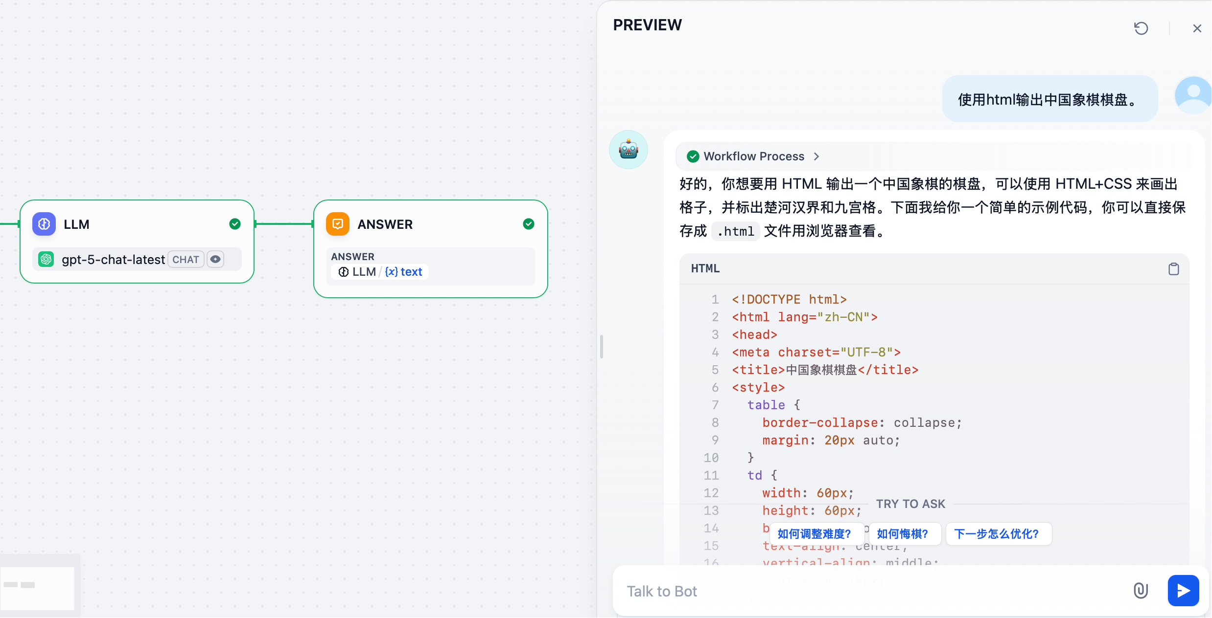 GPT5来了,编程能力强的一批,小白也能编程了的感觉。下面以中国象棋游戏,人机对弈为例,来展示一下过程,我使用的dify工作流来对接的GPT5。