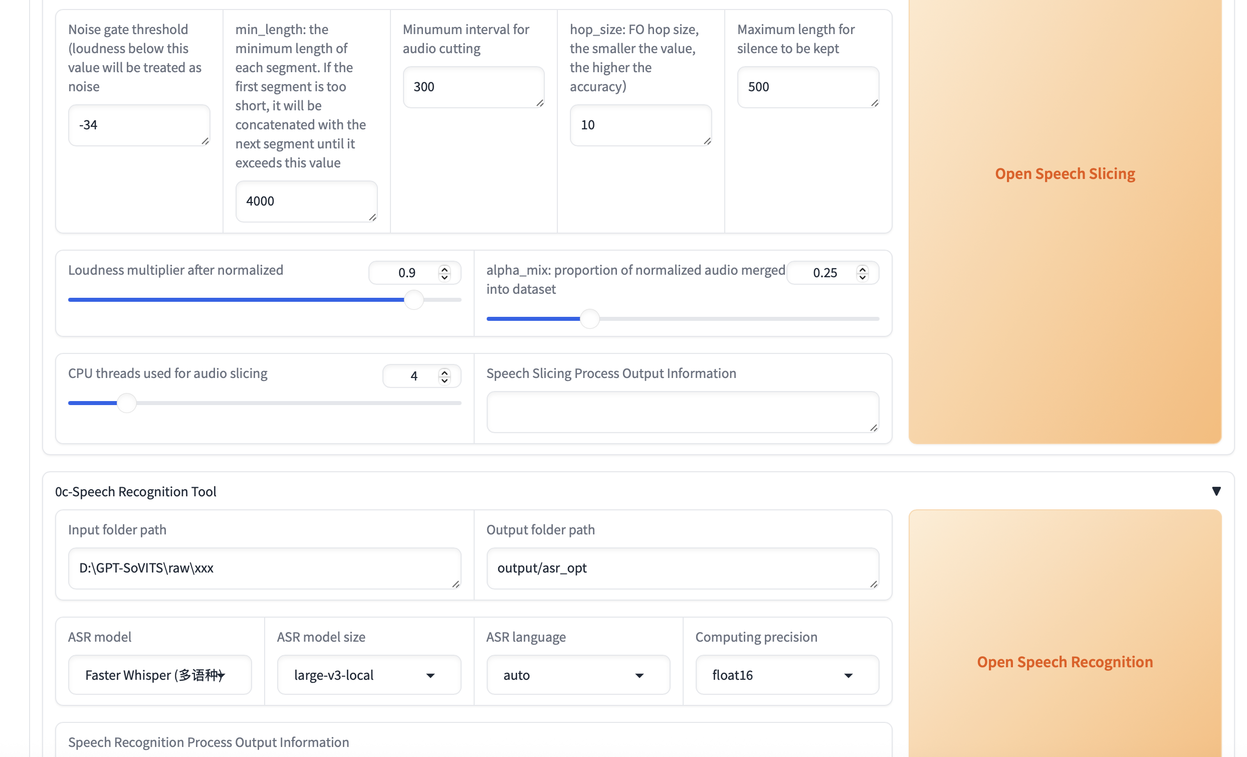 3)依次执行声音拆分、降噪和ASR转写(自动标注)