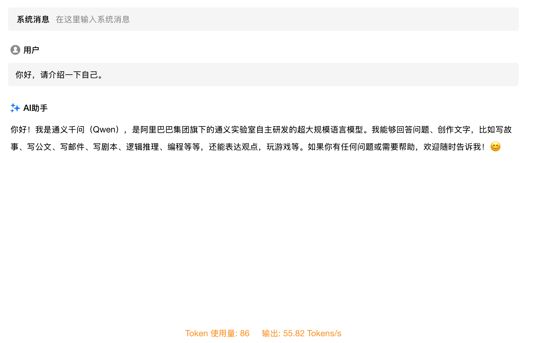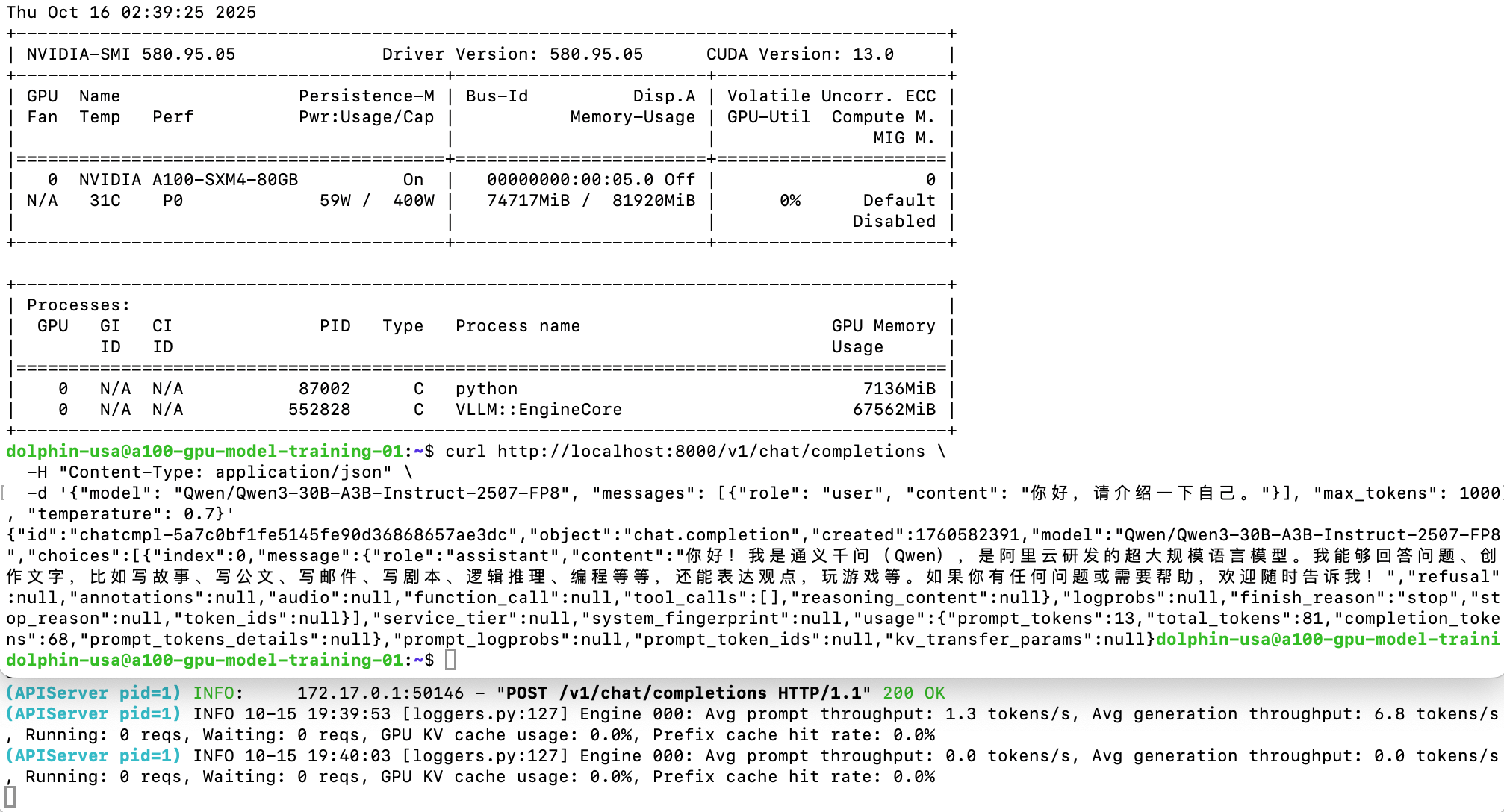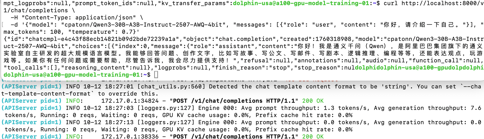 -d '{"model": "cpatonn/Qwen3-30B-A3B-Instruct-2507-AWQ-4bit", "messages": [{"role": "user", "content": "你好,请介绍一下自己。"}], "max_tokens": 100, "temperature": 0.7}'