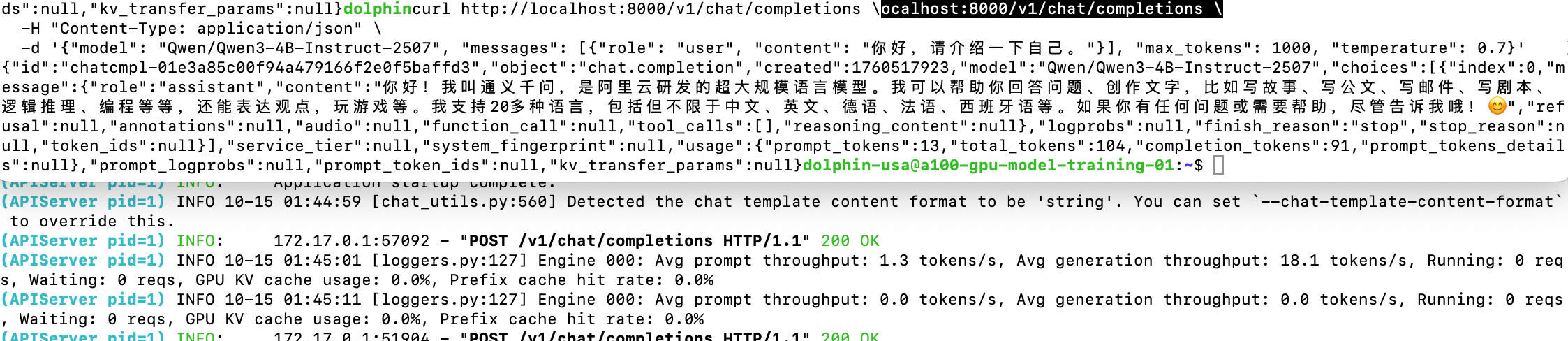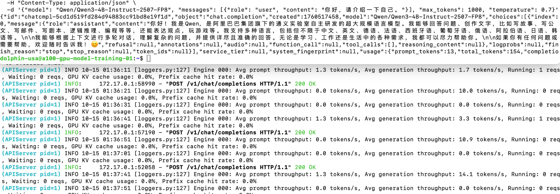 -d '{"model": "Qwen/Qwen3-4B-Instruct-2507", "messages": [{"role": "user", "content": "你好,请介绍一下自己。"}], "max_tokens": 1000, "temperature": 0.7}'