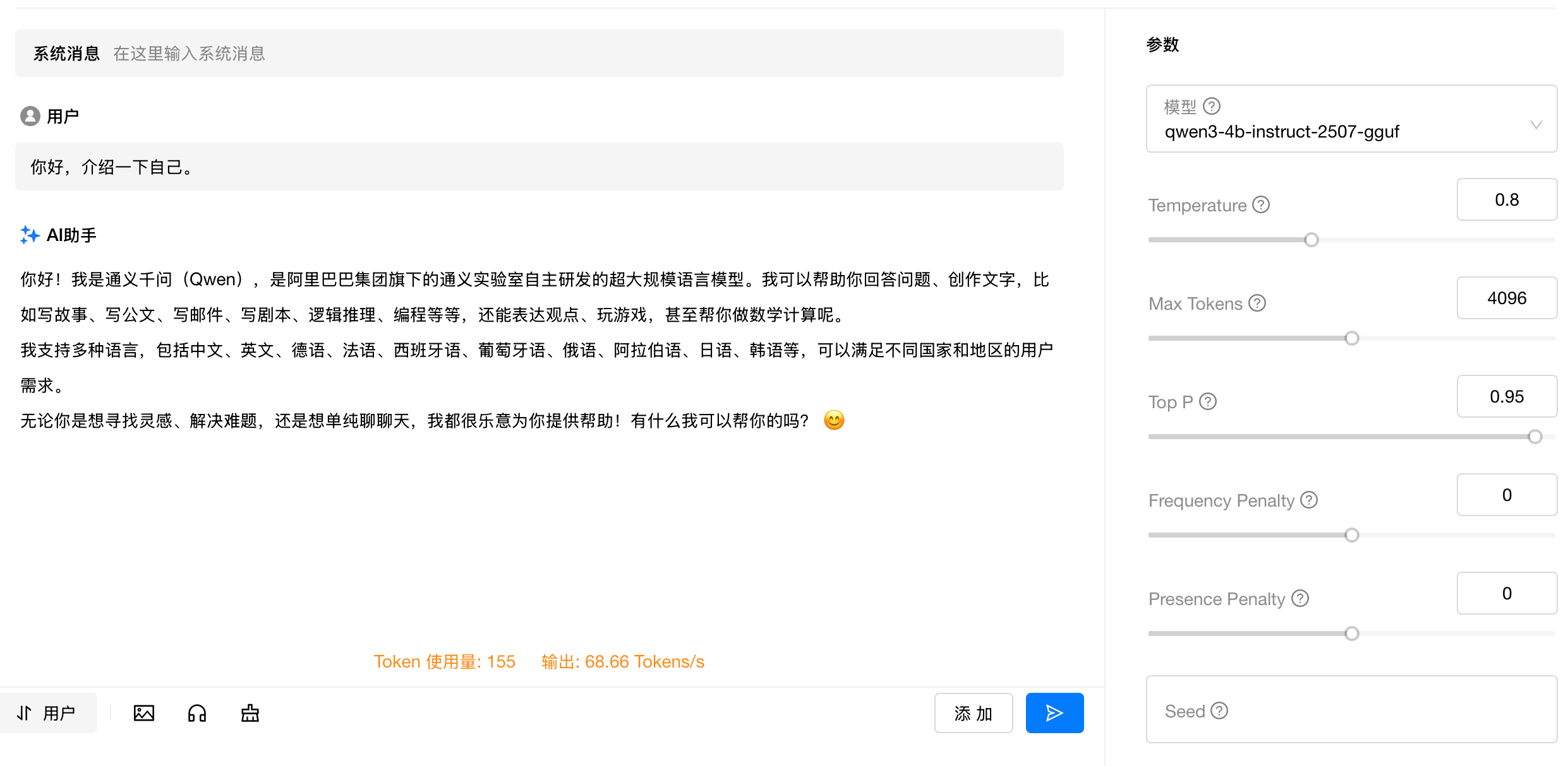 分别以Qwen/Qwen3-4B-Instruct-2507和Qwen/Qwen3-4B-Instruct-2507-FP8进行测试,发现Qwen/Qwen3-4B-Instruct-2507的生成速度反而更快一些。