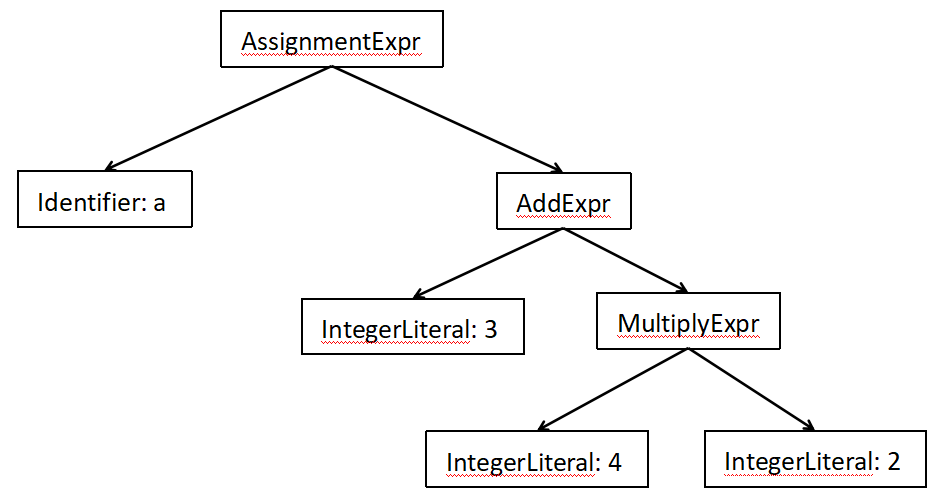 给定表达式a = 3 + 4 * 2,仿照教材图1.4画出此表达式的语法树。