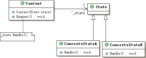 还有印象么?和策略模式的类图一模一样。状态模式封装的是对象的一系列状态,将对象的每个状态都用一个独立的子类来表示。当请求到来的时候根据对象当前的状态使用对应的状态子类来完成。