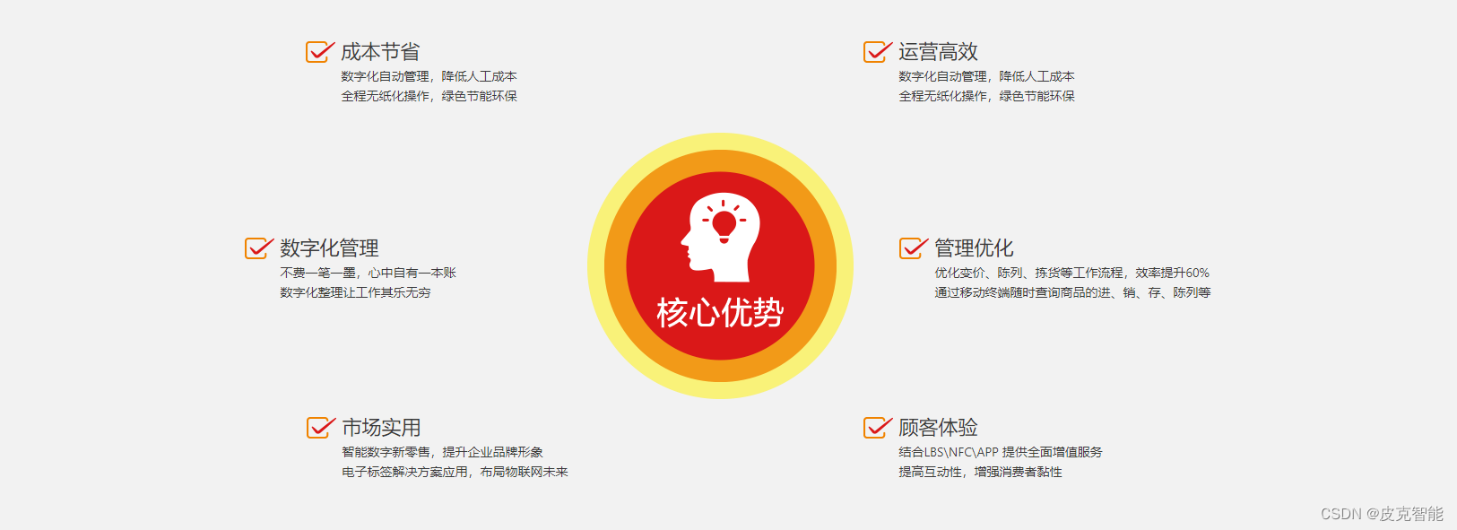 皮克提供价格管控方案,实现门店与企业平台的数据同步,强化终端控制。通过电子价签优化陈列管理,提升门店效率和业绩。门店拣货方案结合智能硬件提高拣货效率,整合订单提升顾客体验。消费者标签方案统一线上线下会员体系,仓储整理方案确保多平台库存同步,电子门牌采用超低功耗设计,提升店铺信息化水平。