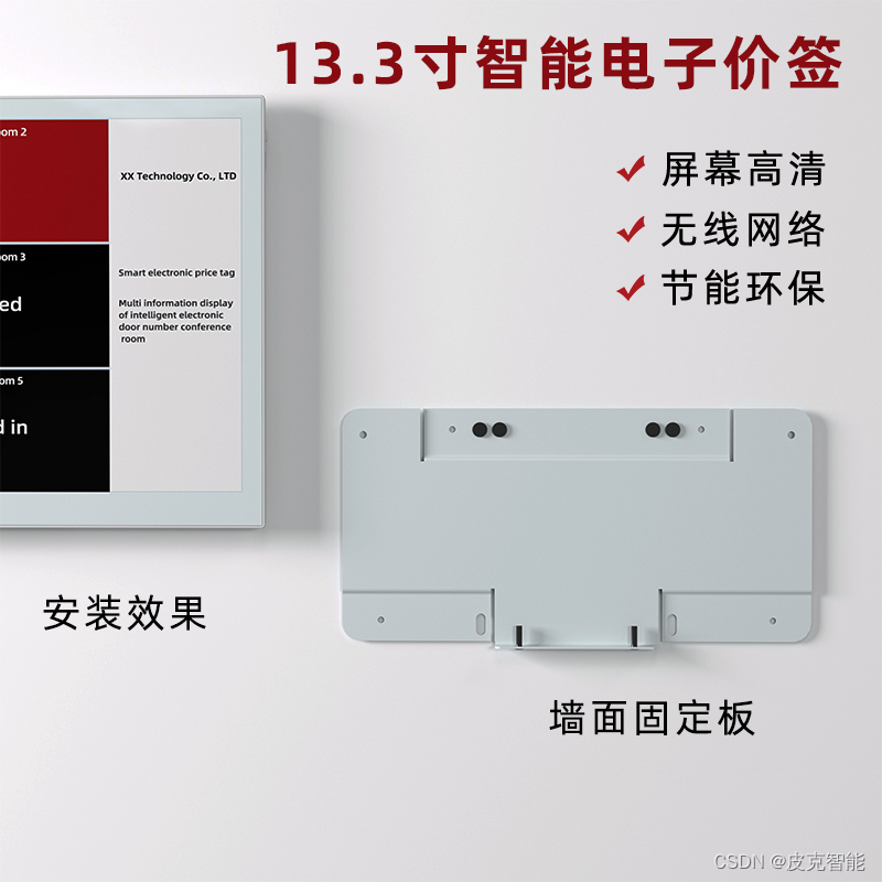 该电子门牌显示屏采用超低功耗设计,一次充电可使用一年,无需接线,通过标准WIFI网络实时在线。其电子墨水屏技术提供清晰显示效果,支持桌面和墙面两种安装方式,适用于医院、学校、办公楼等场所。