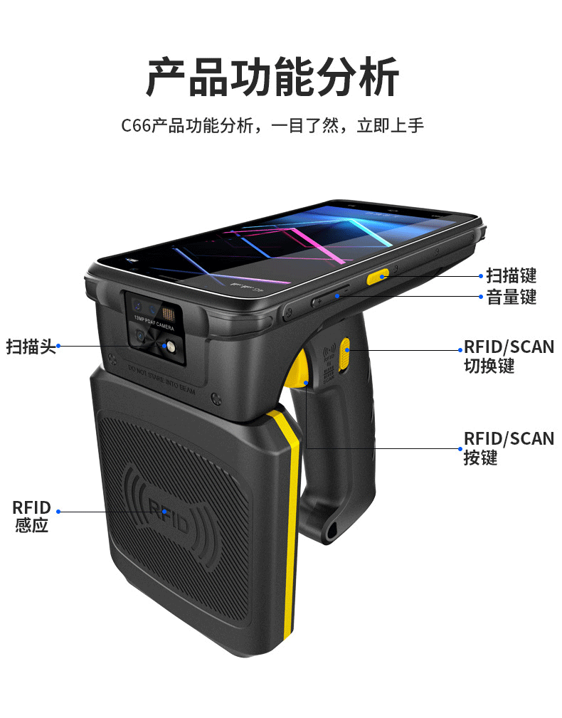 C66超高频模块支持5dBi圆极化天线,可以实现宽广的扫描范围与超过20米的识别距离,覆盖范围光,让实际工作中的扫描读取应用更为灵活,高精准识读,高效便捷。
