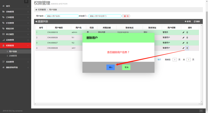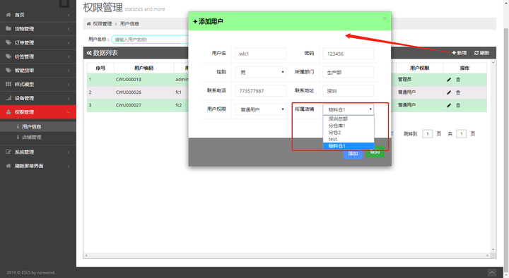 进入“权限管理”->“用户信息”,点击“新增”, 填写用户信息并选择“用户权限”和“所属店铺”: