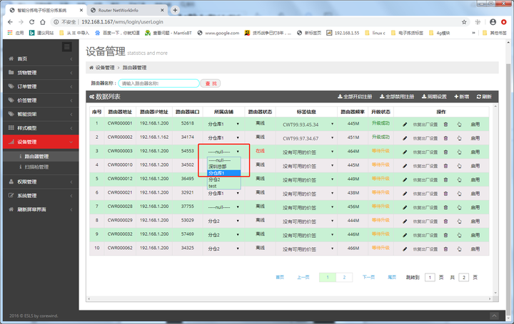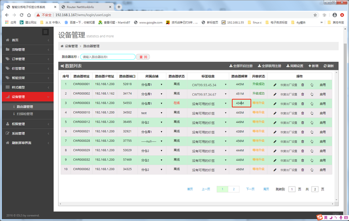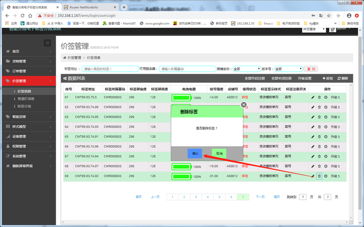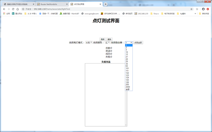 选择需要点亮哪个路由器下的标签,选择亮灯模式和颜色,单击“点亮全部”,然后服务器会下发指令点亮所有选中的路由器下的标签,并显示标签失败的反馈: