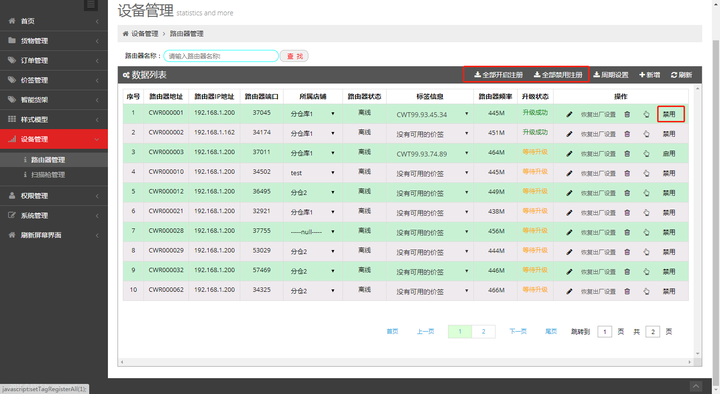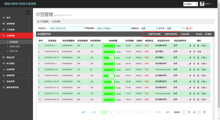 点击“全部开启注册”或“全部关闭注册”, 可以打开或关闭所有基站的注册标签功能;
