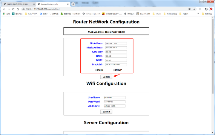 设置完成点Update保存,(保存后界面会刷新成当前ip,重启即可),重启生效;