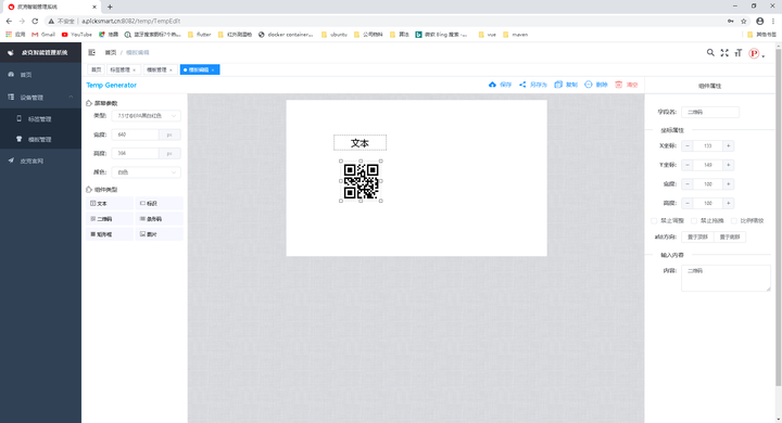 模板有文本,条码,二维码和矩形框三种类型。模板编辑中有右键功能。如下图所示。左边可以选择,相应的控件,当选择了某一个控件,右端会显示相应的属性。可以通过右端的属性来控制控件。
