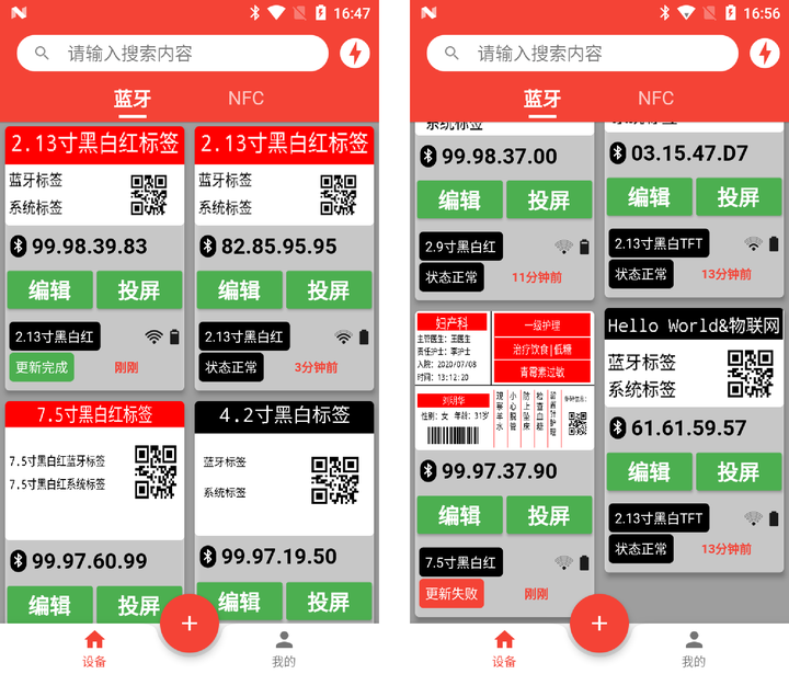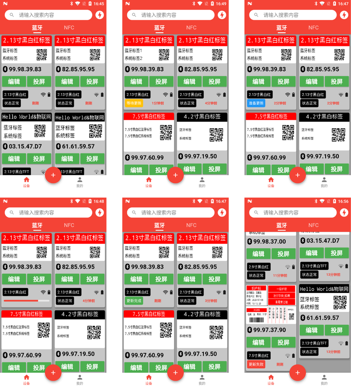 下面是蓝牙标签设备的几个状态的变化,当标签的内容被编辑过后,标签的状态就会变成黄色的【等待更新】标识,如果手动点击【投屏】按钮,标签状态会变成【准备更新】状态,此时手机会自动连接标签,并且会自动更新。可以连续的点击几个标签。如果标签连接成功,之后会出现一个传输数据的进度条。数据传输完成并且成功会提示有【更新成功】的绿色状态。如果数据传输失败,会出现【更新失败】的红色状态。