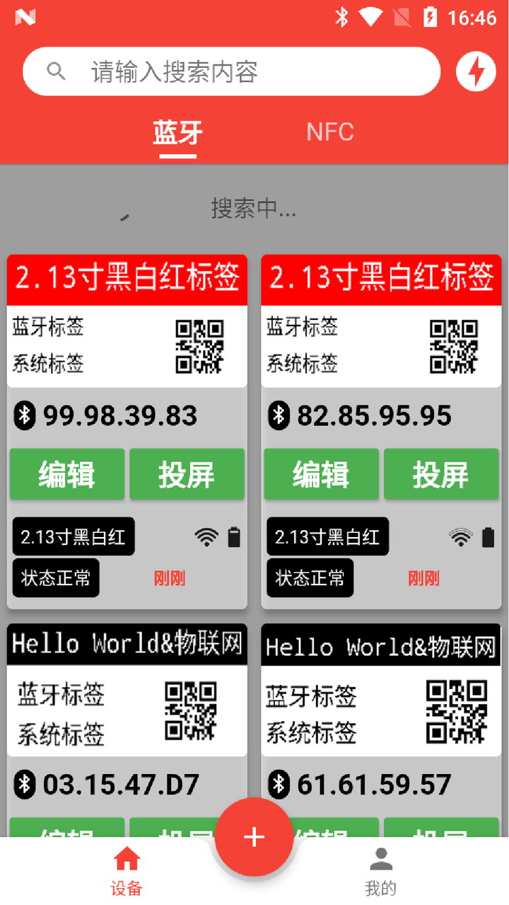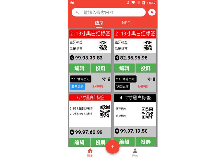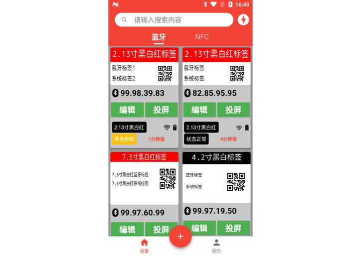 标签内容编辑完之后,返回到【设备】界面之后,会提示对应的标签【等待更新】,如下图所示,这时候需要点击【投屏】按钮,APP就会将更改的内容刷新到标签上面。