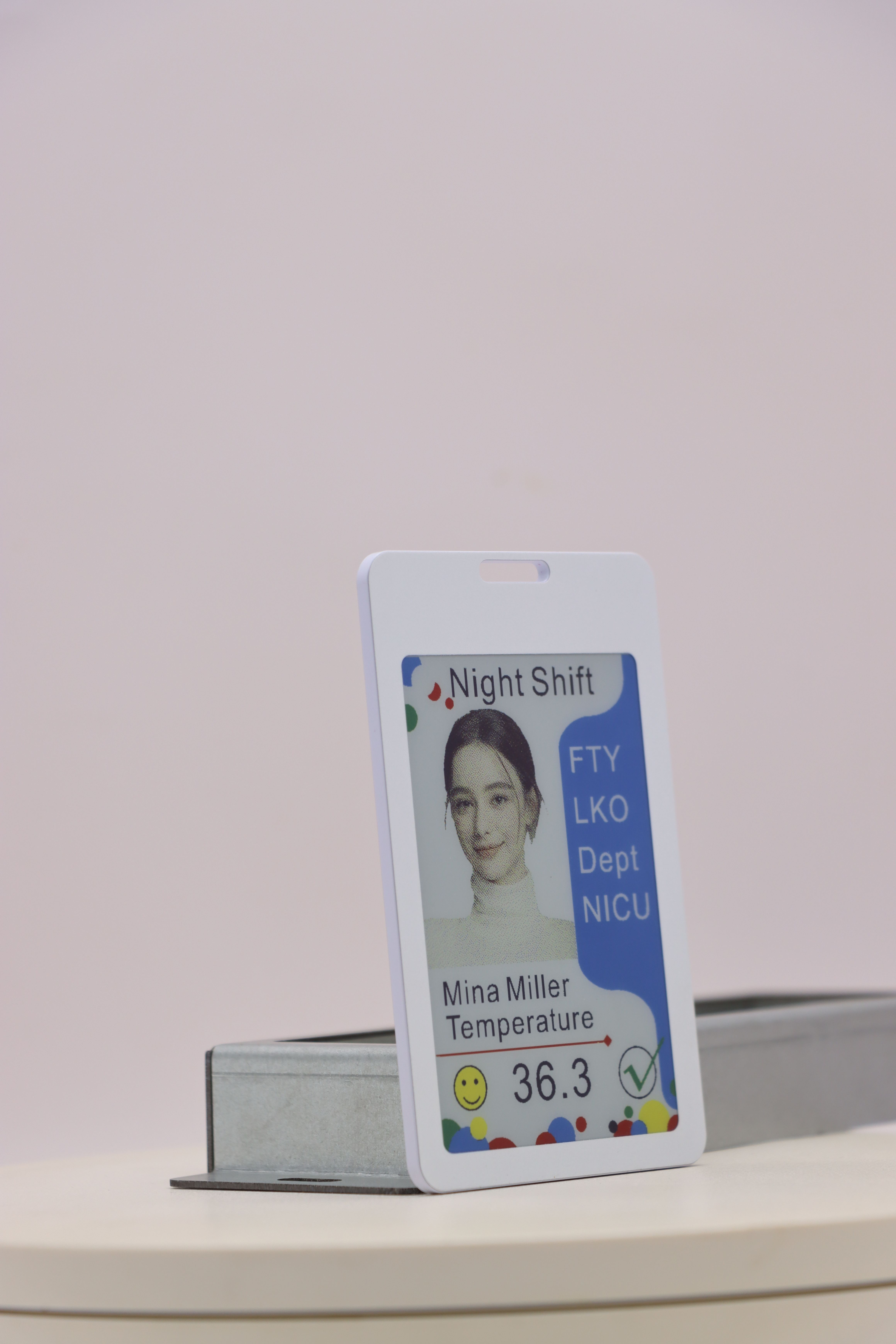 这款电子工牌搭载 3.6 寸墨水屏,支持黑、白、红、黄、蓝、绿六色显示及彩色刷新功能,不仅能清晰呈现员工姓名、部门、职位等基础信息,还可动态展示企业 logo、活动标语等内容,视觉效果鲜明且功耗极低。通信方式上,它兼容蓝牙与 NFC 模式,蓝牙连接可实现远程批量更新信息,无需逐个接触操作;NFC 功能则支持快速打卡、门禁核验,轻轻贴近设备即可完成交互,大幅提升通行效率。