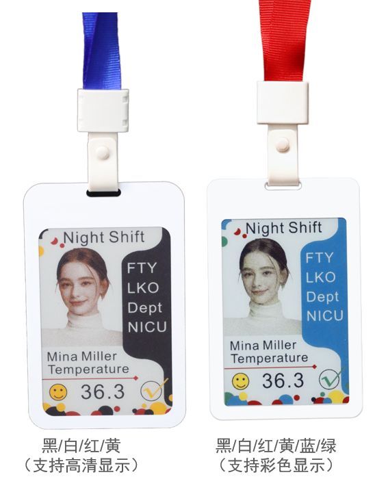相较于传统纸质工牌仅能呈现文字信息的局限,电子工牌支持个性化头像彩色显示,搭配黑、白、红、黄、蓝、绿六色墨水屏,可清晰还原员工头像细节与色彩。一方面,在多人协作的办公场景中,彩色头像能帮助同事快速识别身份,尤其适合新员工入职、跨部门沟通时减少认知成本;另一方面,企业可将品牌色融入头像展示区域,结合动态更新的企业 logo,让工牌成为移动的品牌宣传载体,强化员工身份认同与企业形象传递。