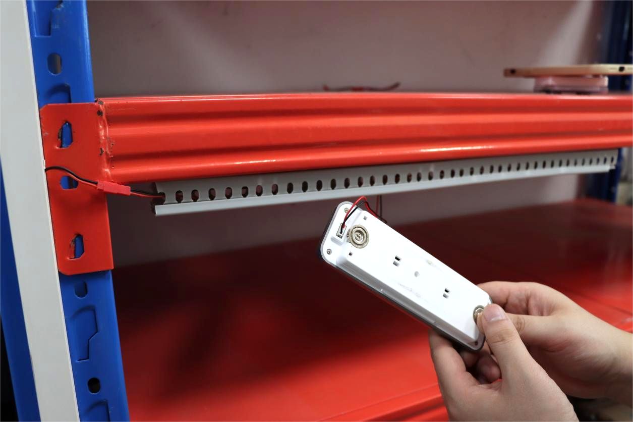 货架贴装:为便于拍摄演示,将线槽贴于货架底部位置,可实际隐藏安装以优化空间。