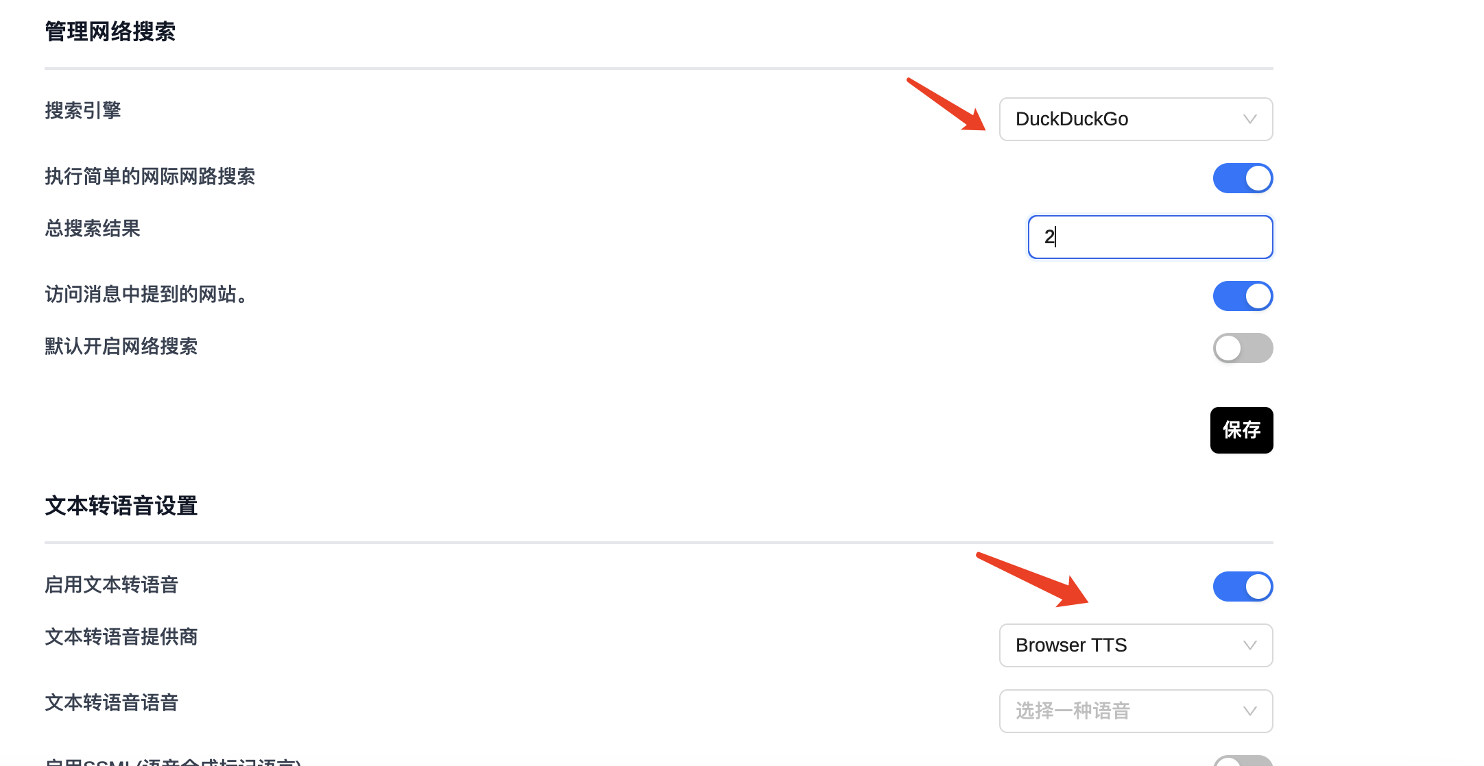 还可以更改默认搜索引擎,让大模型在推理的同时,开启联网搜索功能,文本转语音等。