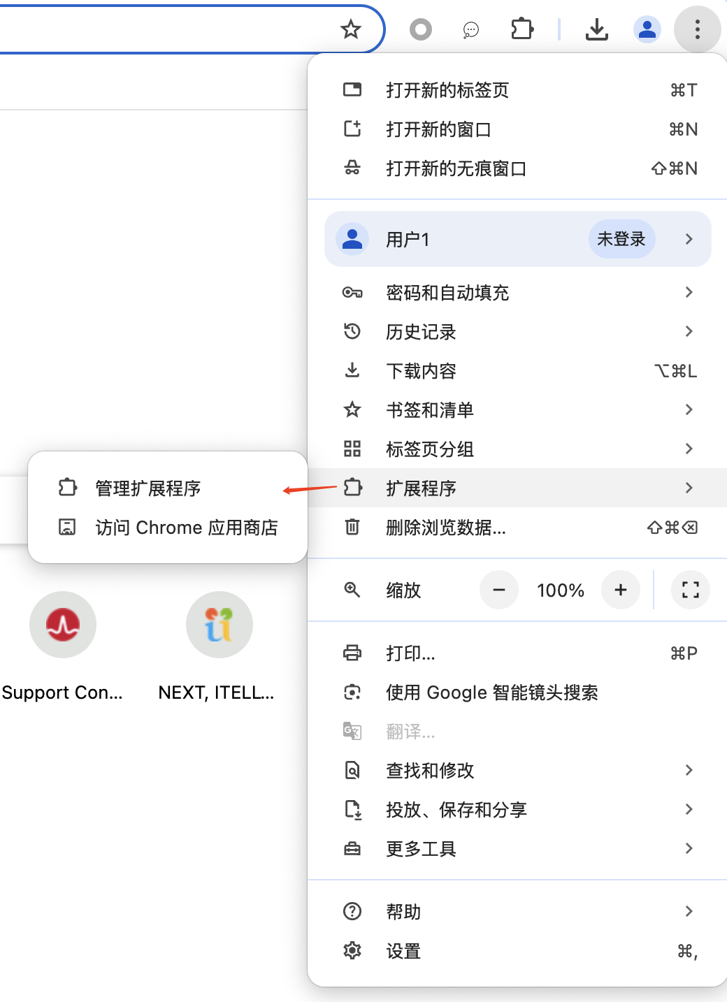 打开Chrome浏览器,点到如下图:更多 - 扩展程序 - 管理扩展程序