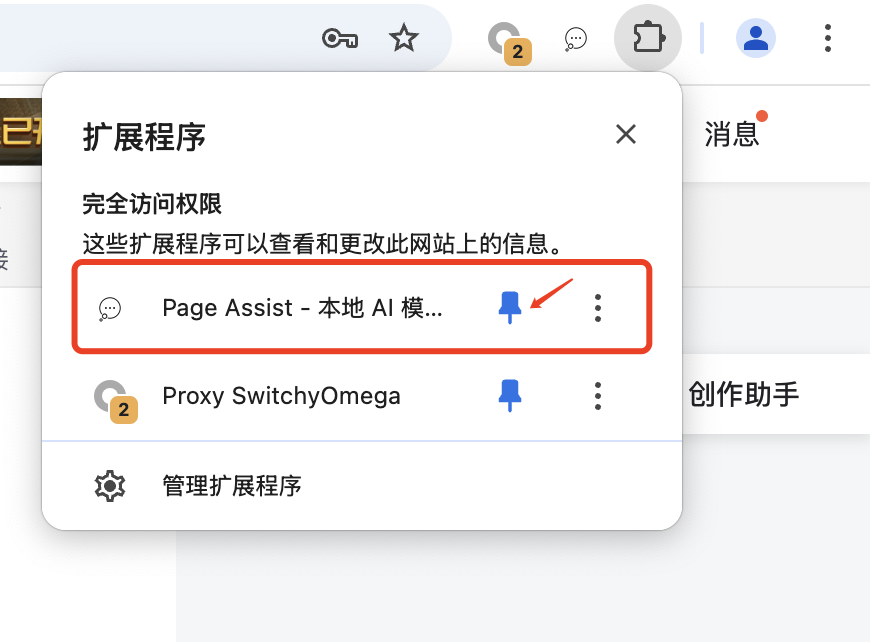 2 浏览器安装后也可将Page Assist插件置顶为固定方便使用。