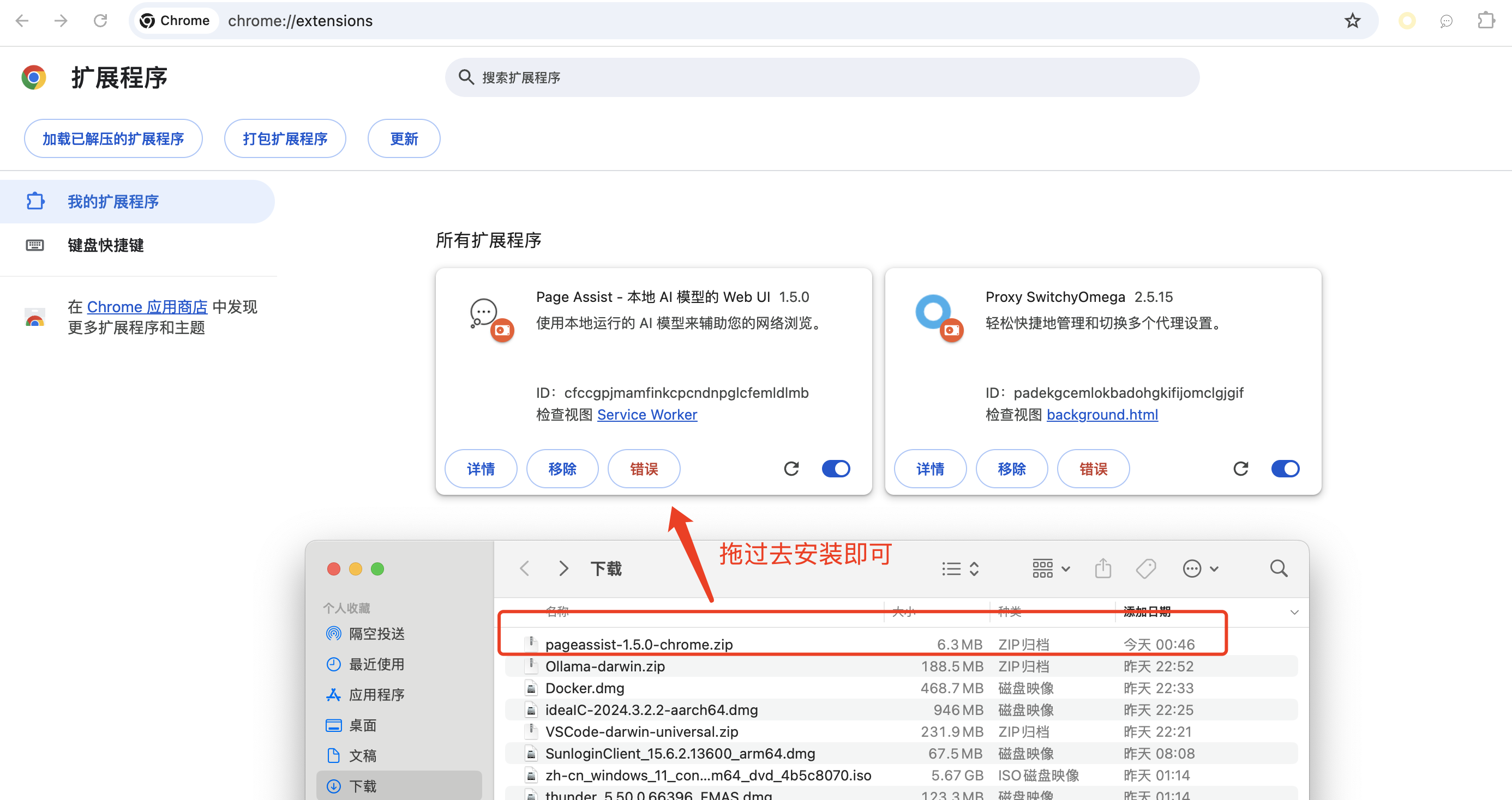 将下载后的pageassist-1.5.0-chrome.zip直接拖过去安装即可。