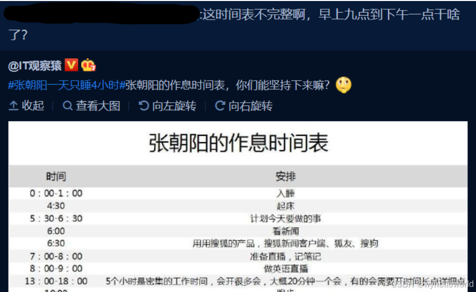 微博上有人发了某老板的作息时间表,表示其每天 4:30 就起床了。但立刻有眼尖的网友问:这时间表不完整啊,早上九点到下午一点干啥了?
