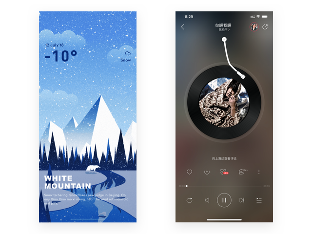 即模拟真实的事物,使用户更容易理解。例如:天气应用中的天气插图、音乐播放器的胶片都是生活中熟悉的场景和物品,降低理解成本。