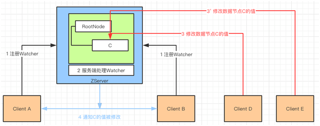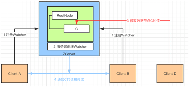 ZooKeeper 客户端(Client)会在指定的节点(/RootNote/C)上注册一个 Watcher,ZNode 上的 C 被更新的时候,服务端就会通知 ClientA 和 ClientB。