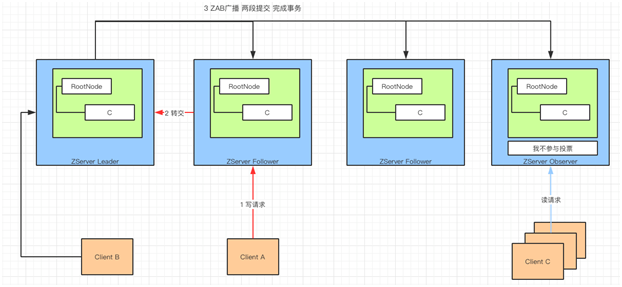 事物都由 Leader 来处理,通过两段提交的方式对其他 Server 发起广播。为了增强对非事务请求的处理效率,ZooKeeper 加入了 Observer 来帮忙。