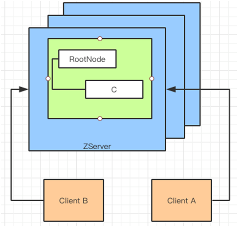 通过上面的例子,客户端 ClientA 和 ClientB 需要读取 C 的内容。这个 C 就作为树的叶子节点存放在 ZooKeeper 的 ZNode 中。