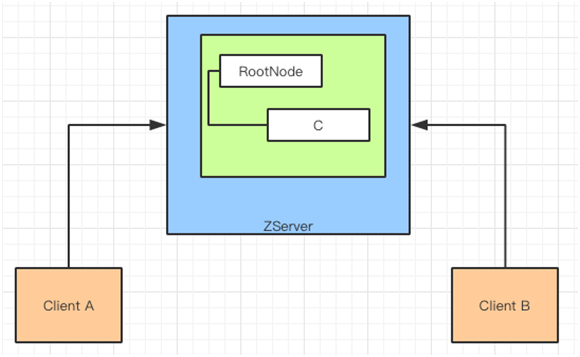 ZooKeeper 会建立一个 ZooKeeper 服务器,暂且称为 ZServer,用它来存放 C 的值。为 A,B 两个应用分别生成两个客户端,称作 ClientA 和 ClientB。