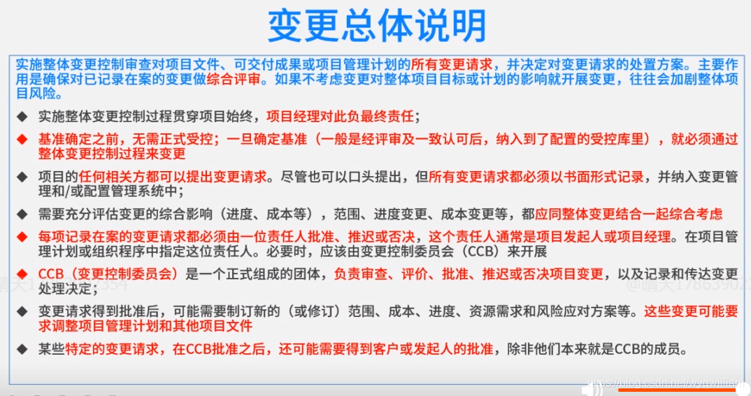 变更请求源于项目执行和监控阶段,包括预防、补救措施,并影响基准更新。项目经理负责变更审批,变更管理计划是项目管理计划的一部分。批准的变更需更新文件和基准,而拒绝的变更记录在变更日志中。变更流程涉及评估、审批和沟通,确保综合影响考虑,且项目经理可批准紧急变更。