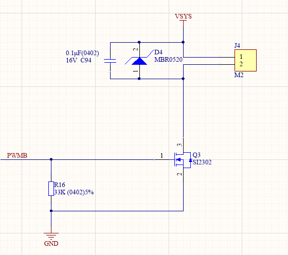 在电路中加入了,肖特基续流二极管和滤波电容,作用是防止电机被击穿和当电源断开时,将电机上的电流释放的作用。 然后利用mos管可以驱动大电流的特点作为驱动元件。R16是一个分压电阻,为mos管提供电压用。