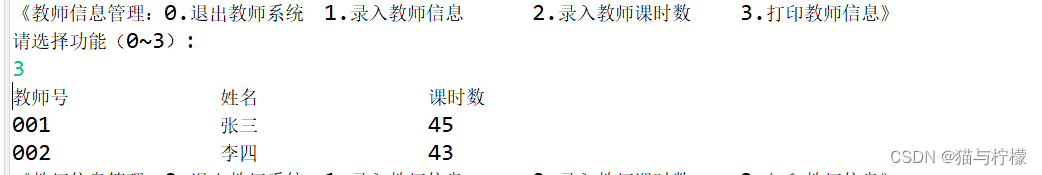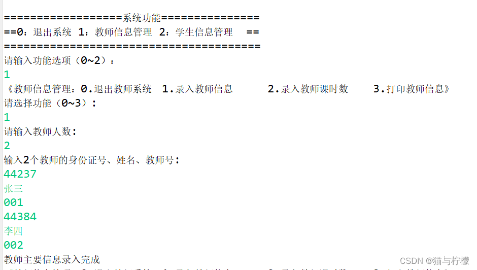 - 进入教师信息管理或学生信息管理后应显示子菜单,供用户选择它们的子功能,实现相应的信息管理。