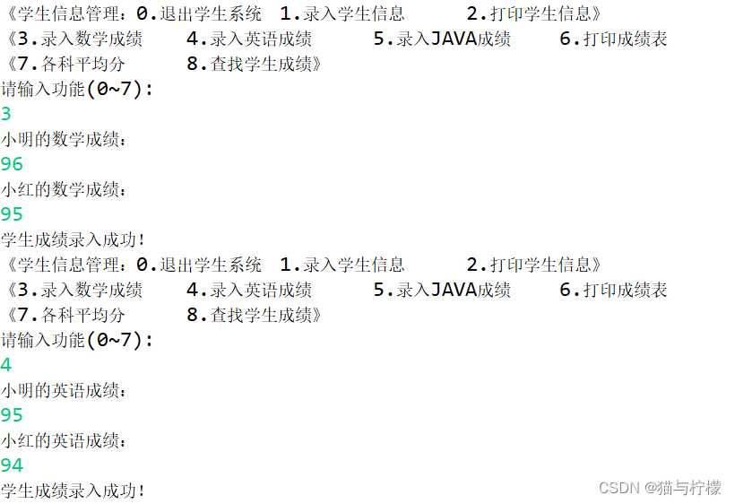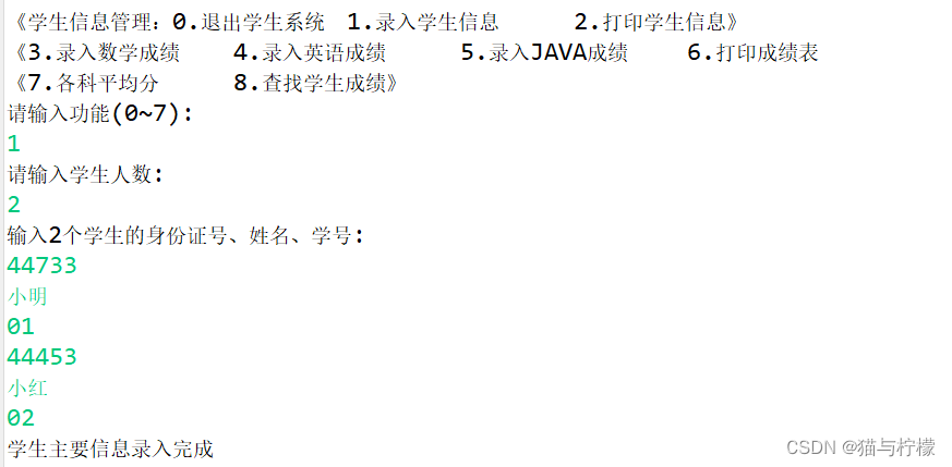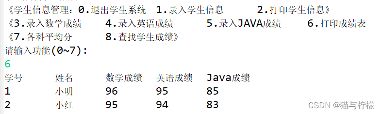 - 学生信息管理中至少有学生基本信息录入、打印学生基本信息表、数学成绩录入、英语成绩录入、Java成绩录入、输出成绩表等功能;