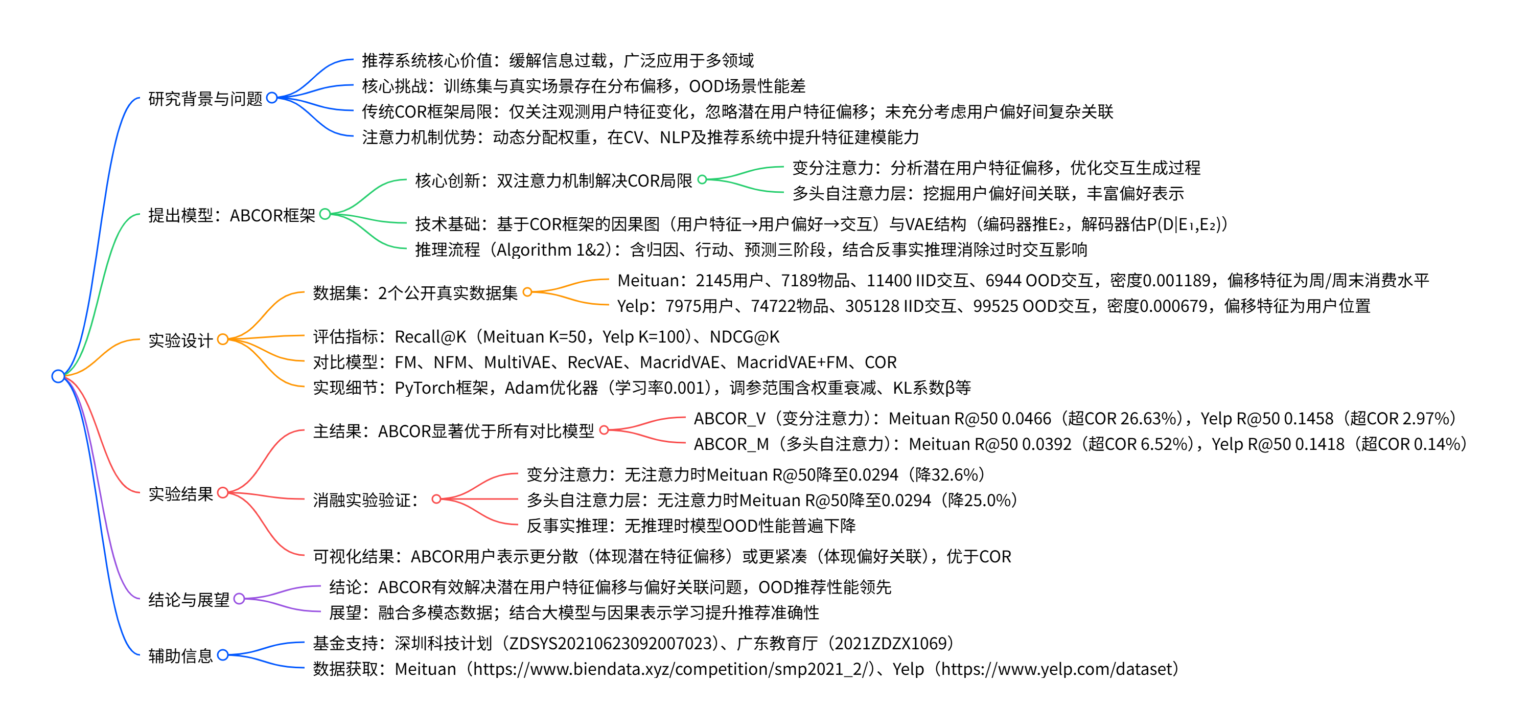 为解决传统因果分布外(OOD)推荐框架(如 COR)忽略潜在用户特征偏移和不同用户偏好间关联的问题,本文提出注意力机制驱动的因果分布外推荐框架(ABCOR) :一方面通过变分注意力分析潜在用户特征偏移信息、优化交互生成过程,另一方面集成多头自注意力层挖掘复杂用户偏好关系以提升干预后交互概率计算的准确性;在 Meituan 和 Yelp 两个公开数据集上的实验表明,ABCOR 在 Recall@K 和 NDCG@K 等指标上显著优于 COR 等现有主流模型(如 Meituan 数据集上 R@50 提升 26.63%、N@50 提升 28.71%),且消融实验验证了变分注意力、多头自注意力层及反事实推理对模型性能的关键作用,代码已开源(https://github.com/YaffaGan/ABCOR)。