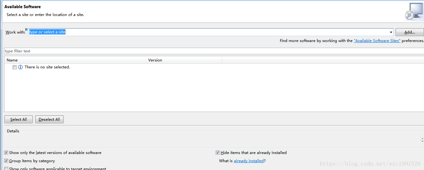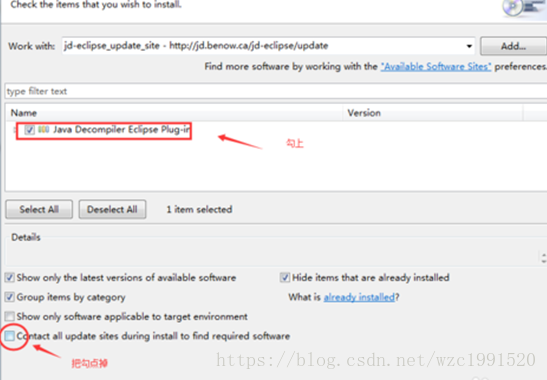 4,点击ok按钮出现下面显示的对话框,勾上对话框中间显示的反编译插件,然后把Contactall update sites install to find required software前面的勾点掉,防止它寻找指定的软件前先访问所更新站点,耗费时间。然后一直点击next就安装完成了,安装完成之后重新启动eclipse。