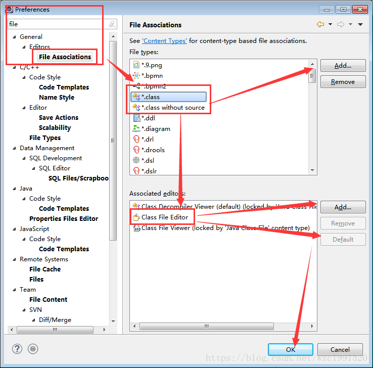 5、重启之后,在窗口菜单栏点击Widow->Preference->General->Editors->File Associations,将FileType里的*.class和*.classwithout source的Associated editors下面的Class File Editor设置成default即可,如下图所示。