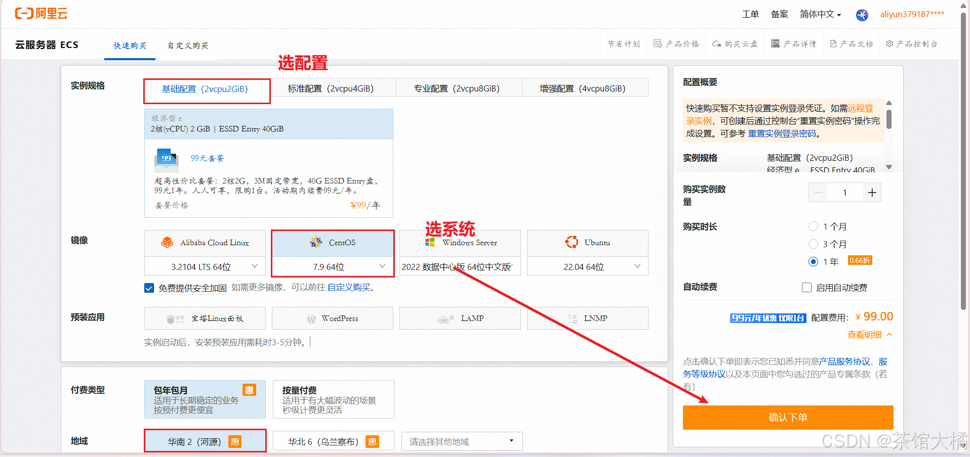 直接去阿里云、腾讯云等大厂商都有提供,学习用的话一般2核2G就够了,预算不够1核也没问题。因为我有阿里云的优惠卷,所有果断白嫖三个月服务器。开服务器的过程很简单,选好配置,然后预装一个操作系统【推荐:centos】