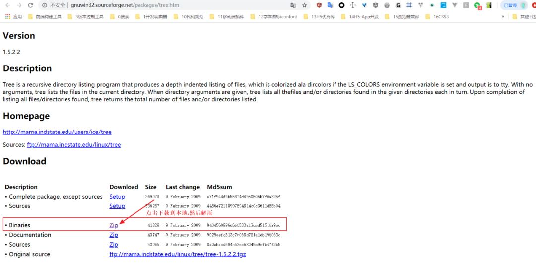 下载tree,Binaries版本(http://gnuwin32.sourceforge.net/packages/tree.htm)如下图所示