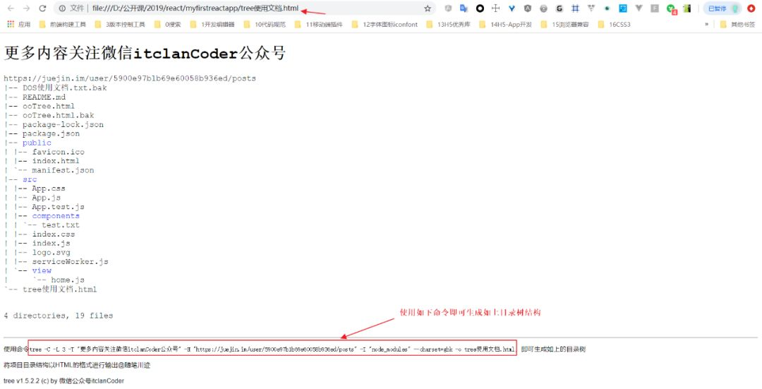 使用如下命令: tree -C -L 3 -T "欢迎关注微信itclanCoder公众号" -H "http://mama.indstate.edu/users/ice/00Tree.html" -I "node_modules" --charset=gbk -o ooTree.html