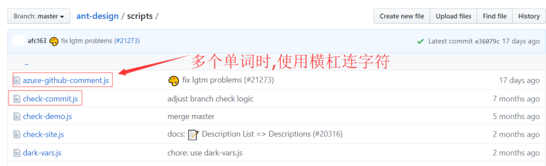 js文件名,当遇到多个单词组成时,采用中划线连接方式,比如说:比如检查commit提交文件,check-commit.js,首字母小写,如下所示 -