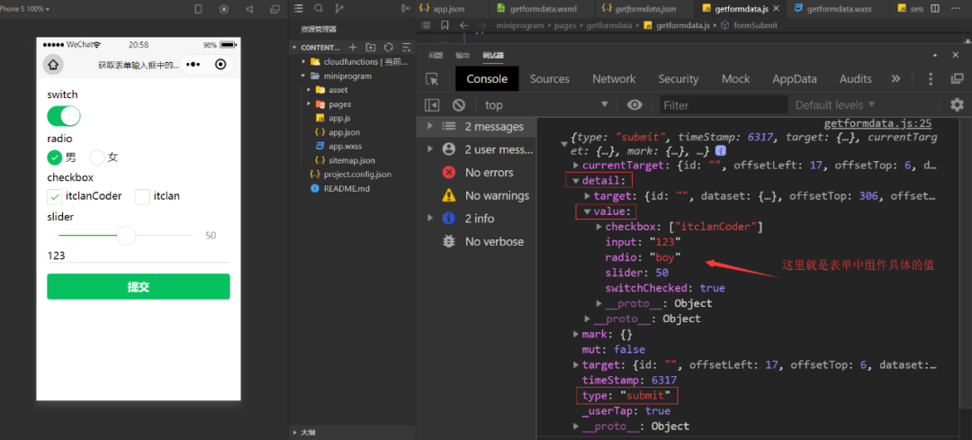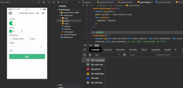 console.log(switchChecked, radio, checkbox, slider, input); // true "boy" ["itclanCoder"] 50 "123"
